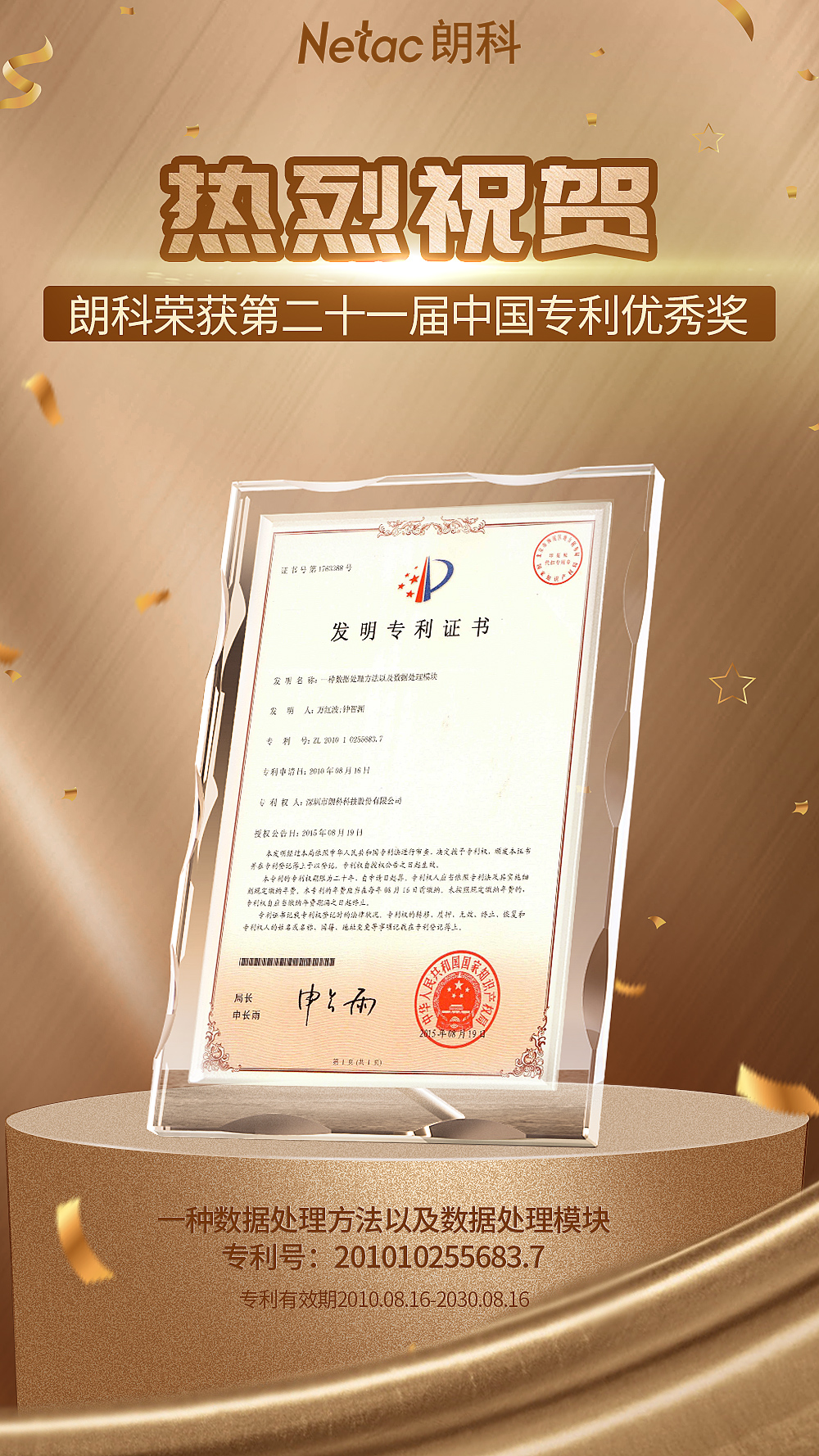 继朗科闪存盘基础发明专利(专利号:99117225.6)于2013年荣获第十五届中国知识产权最高奖项——中国专利金奖后,2019年10月12日,朗科公司的《一种数据处理方法以及数据处理模块》(专利号:201010255683.7)再次荣获第二十一届中国专利优秀奖,有效期至2030年8月16日。